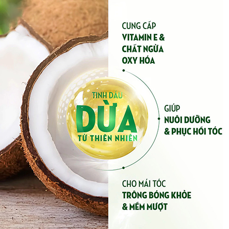 - Chứa tinh dầu dừa thiên nhiên, giàu Vitamin E & chất ngừa oxy hóa, giúp bổ sung protein cần thiết cho tóc, hỗ trợ nuôi dưỡng và phục hồi phần tóc bị hư tổn, giảm tình trạng khô xơ, cho mái tóc óng mượt trông thấy.