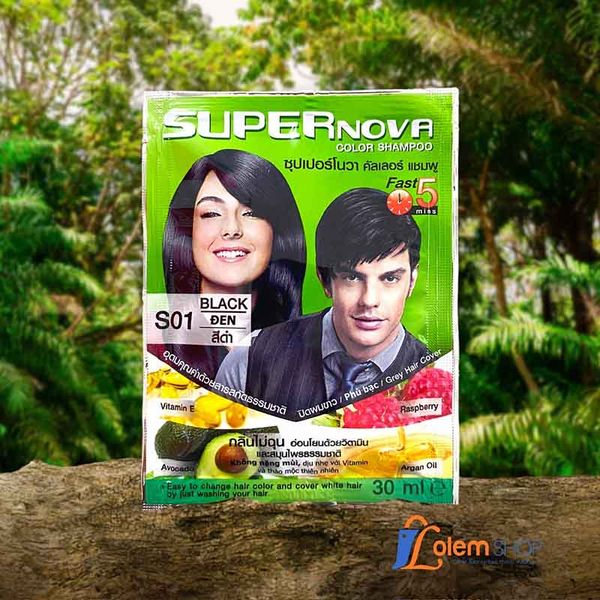 Dầu gội nhuộm Super Nova giúp thay đổi màu tóc dành cho tóc phủ bạc S01 (màu đen). Với các thành phần từ thảo dược thiên nhiên giúp bảo vệ tóc tránh tác hại của ánh nắng mặt trời và sự ô nhiễm của môi trường . Đồng thời, giữ độ ẩm cho tóc giúp tóc đen mượt và luôn bồng bềnh