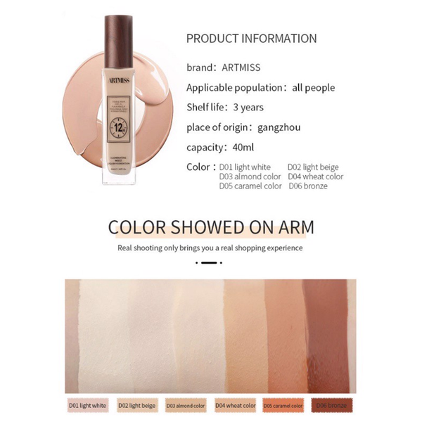 Sản phẩm kem nền 12 giờ nhà ARTMISS che khuyết điểm không chứa dầu, làm sáng màu da, dưỡng ẩm, mềm mại và nhẹ. Khi trang điểm tạo một lớp trang điểm nude tự nhiên, che phủ các khuyết điểm trên da, giúp lỗ chân lông trên da vô hình.