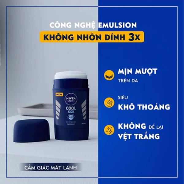 Sáp khử mùi Nam Nivea Men Cool Kick Mát Lạnh là sản phẩm khử mùi cho nam đến từ thương hiệu mỹ phẩm Nivea của Đức, chứa công thức tạo cảm giác mát lạnh lan tỏa trên da, giúp giảm tiết mồ hôi và ngăn mùi hiệu quả suốt 48 giờ với mùi hương nam tính.
