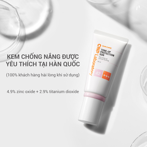 Với kem chống nắng dành cho da hỗn hợp CNP Laboratory Tone-up Protection Sun là một dòng kem chống nắng thế hệ mới sở hữu chỉ số chống nắng SPF42 PA++++ được kết hợp từ 2 màng lọc chống nắng vật lý: 4,9% Zinc Oxide, 2,9% Titanium Dioxide và 3 màng lọc chống nắng hóa học: Octinoxate, Octisalate và Amiloxate mang lại hiệu quả chống nắng tốt, ngăn cản sự ảnh hưởng của UVB gây bỏng rát, cháy sạm, khô da, và UVA gây phá vỡ cấu trúc tế bào da, lão hóa, thậm chí ung thư da. Sản phẩm phù hợp với người làm văn phòng, ở trong môi trường có bóng mát với bảng thành phẩn được điều chế ở liều lượng an toàn, phù hợp cho làn da yếu, nhạy cảm.