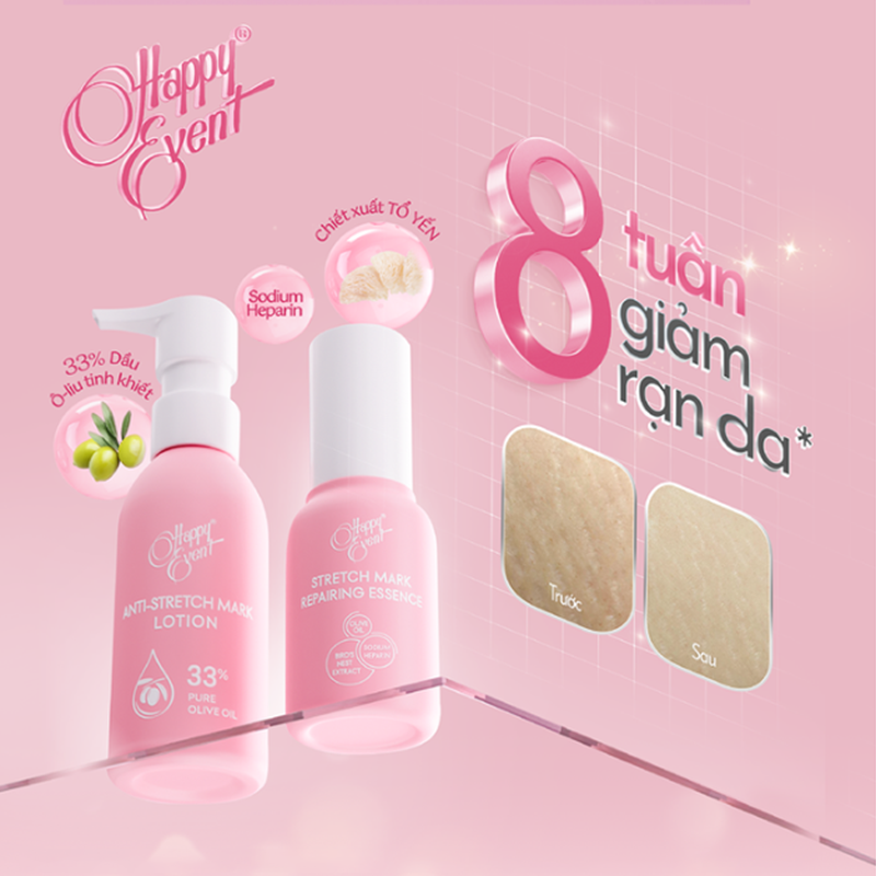 - SỮA DƯỠNG ẨM – NGỪA RẠN DA HAPPY EVENT với 33% dầu Ô-liu tinh khiết giàu vitamin A, K, E, D; chiết xuất tổ yến thủy phân và Sodium Heparin giúp dưỡng ẩm sâu, hỗ trợ tăng tính đàn hồi cho da. Từ đó giúp ngăn ngừa hiệu quả sự hình thành vết rạn, duy trì trạng thái săn chắc, mịn màng vốn có của làn da.